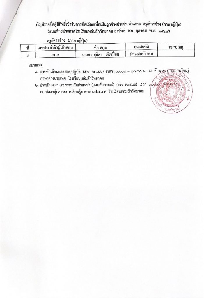 ประกาศรายชื่อผู้มีสิทธิ์สอบเป็นลูกจ้างชั่วคราว ตำแหน่งครูอัตราจ้าง (ภาษาญี่ปุ่น)Posted on ตุลาคม 29, 2021 by adminann adminann