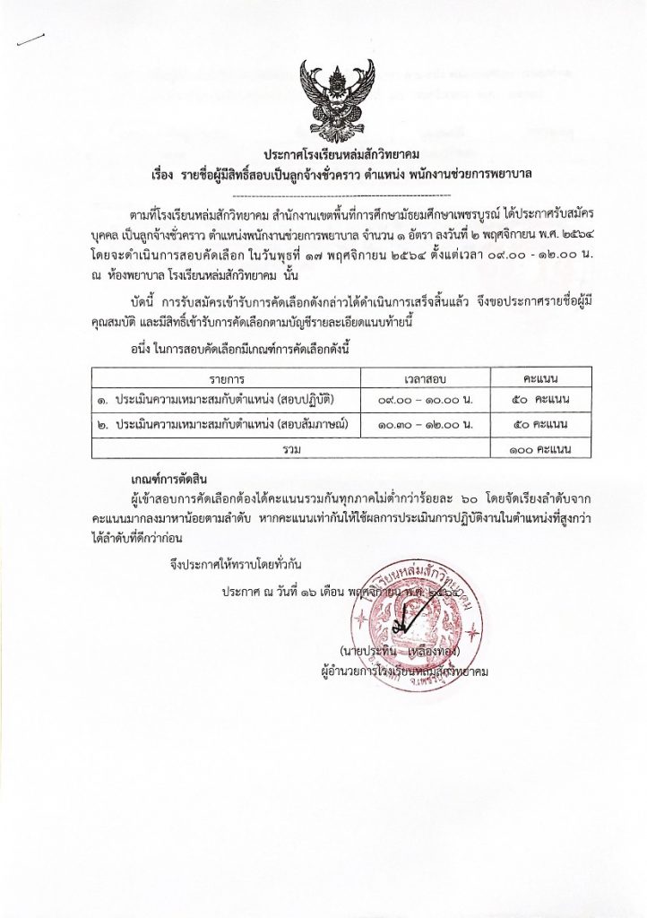 ประกาศรายชื่อผู้มีสิทธิ์สอบเป็นลูกจ้างชั่วคราว ตำแหน่งพนักงานช่วยการพยาบาลPosted on พฤศจิกายน 16, 2021 by adminann adminann