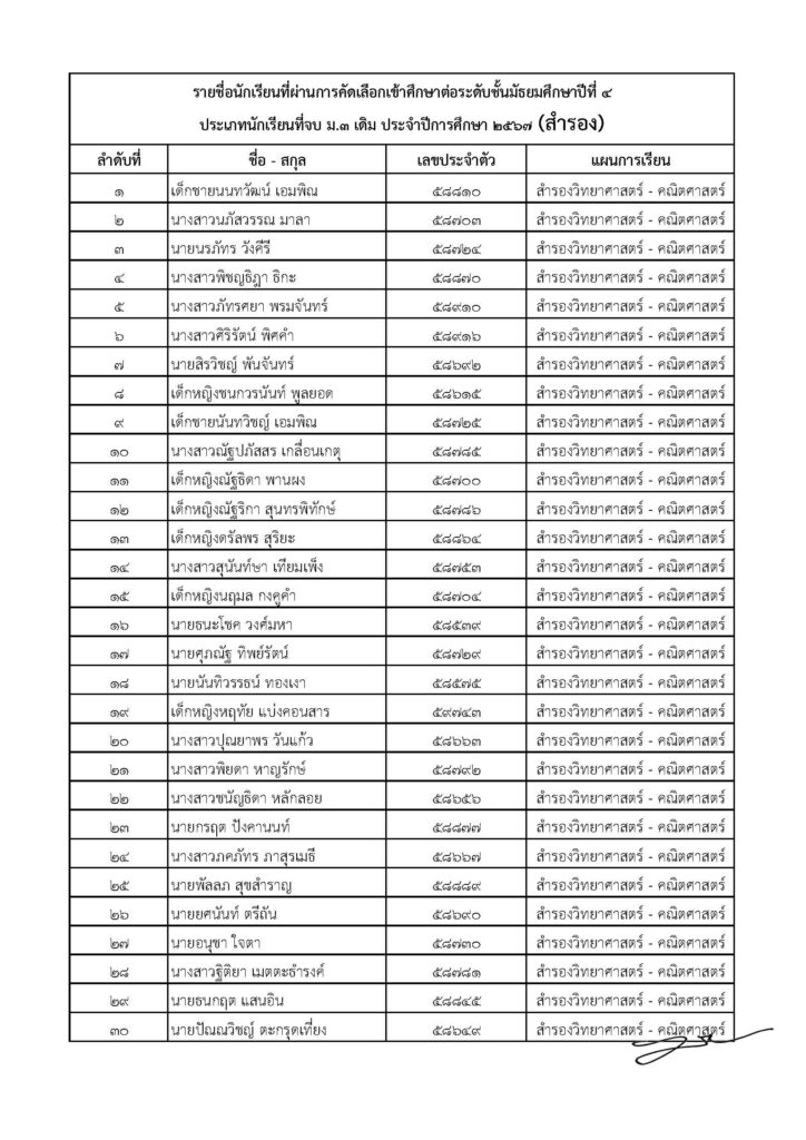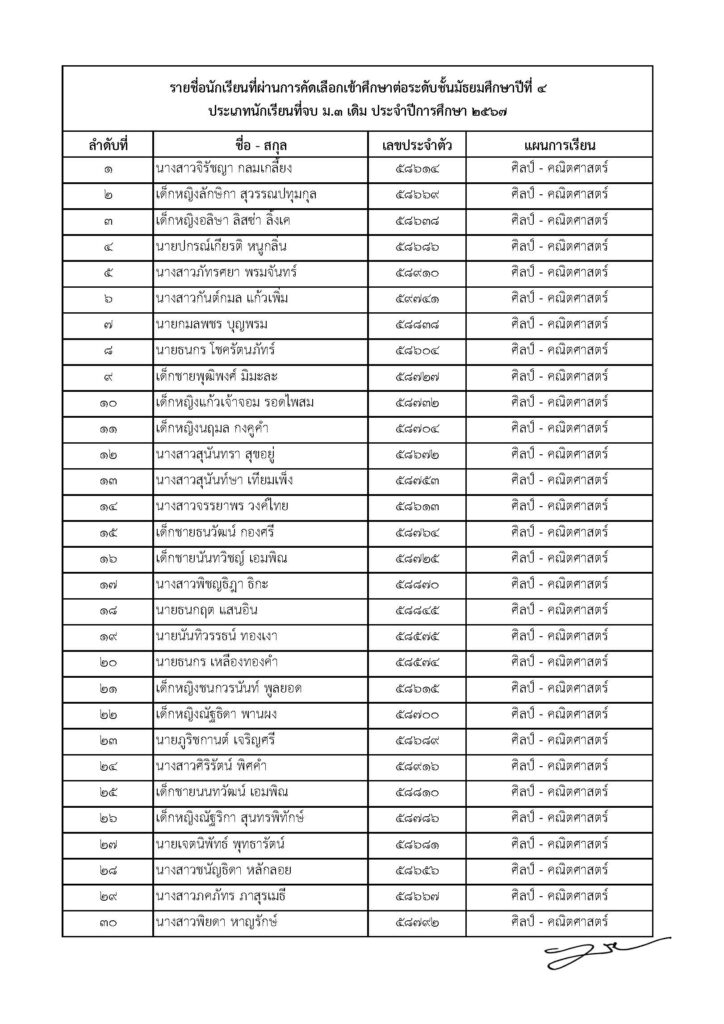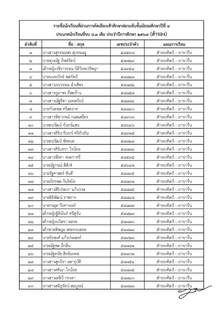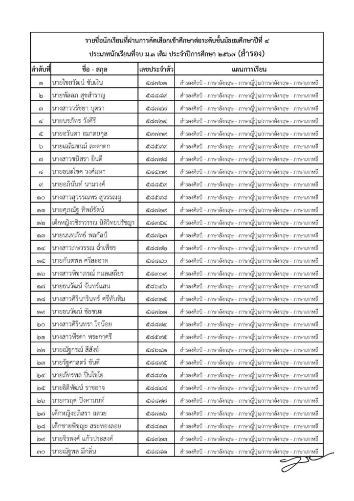 ประกาศรายชื่อนักเรียนที่ผ่านการคัดเลือกเข้าศึกษาต่อระดับชั้นมัธยมศึกษาปีที่ 4 ประเภทนักเรียนที่จบชั้นมัธยมศึกษาปีที่ 3 (เดิม) ประจำปีการศึกษา 2567