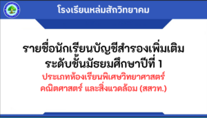 ประกาศโรงเรียนหล่มสักวิทยาคม เรื่อง รายชื่อนักเรียนบัญชีสำรองเพิ่มเติม ระดับชั้นมัธยมศึกษาปีที่ 1 ประเภทห้องเรียนพิเศษวิทยาศาสตร์ คณิตศาสตร์ เทคโนโลยี และสิ่งแวดล้อม (สสวท.) ปีการศึกษา 2567
