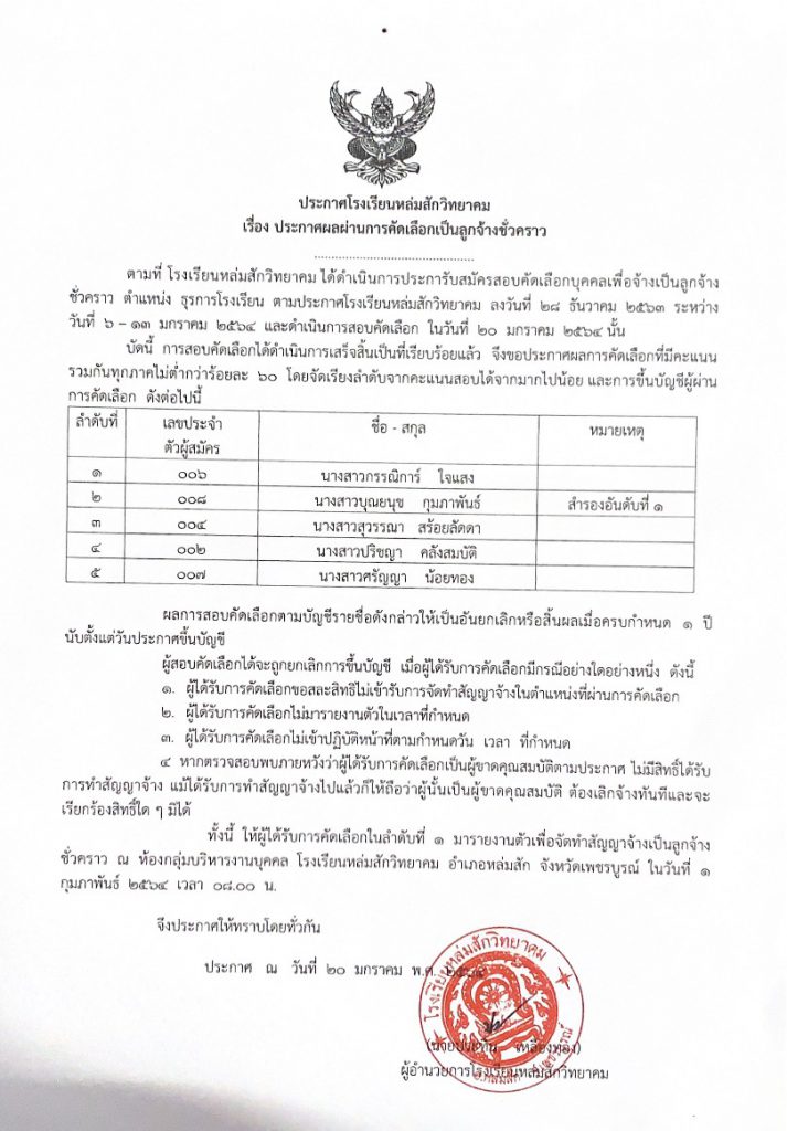 ประกาศผลผ่านการคัดเลือกเป็นลูกจ้างชั่วคราว ตำแหน่งธุรการโรงเรียนPosted on มกราคม 20, 2021มกราคม 20, 2021 by adminann adminann