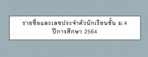 รายชื่อและเลขประจำตัวนักเรียนชั้น ม.4 ปีการศึกษา 2564Posted on พฤษภาคม 31, 2021พฤษภาคม 31, 2021 by yingkun